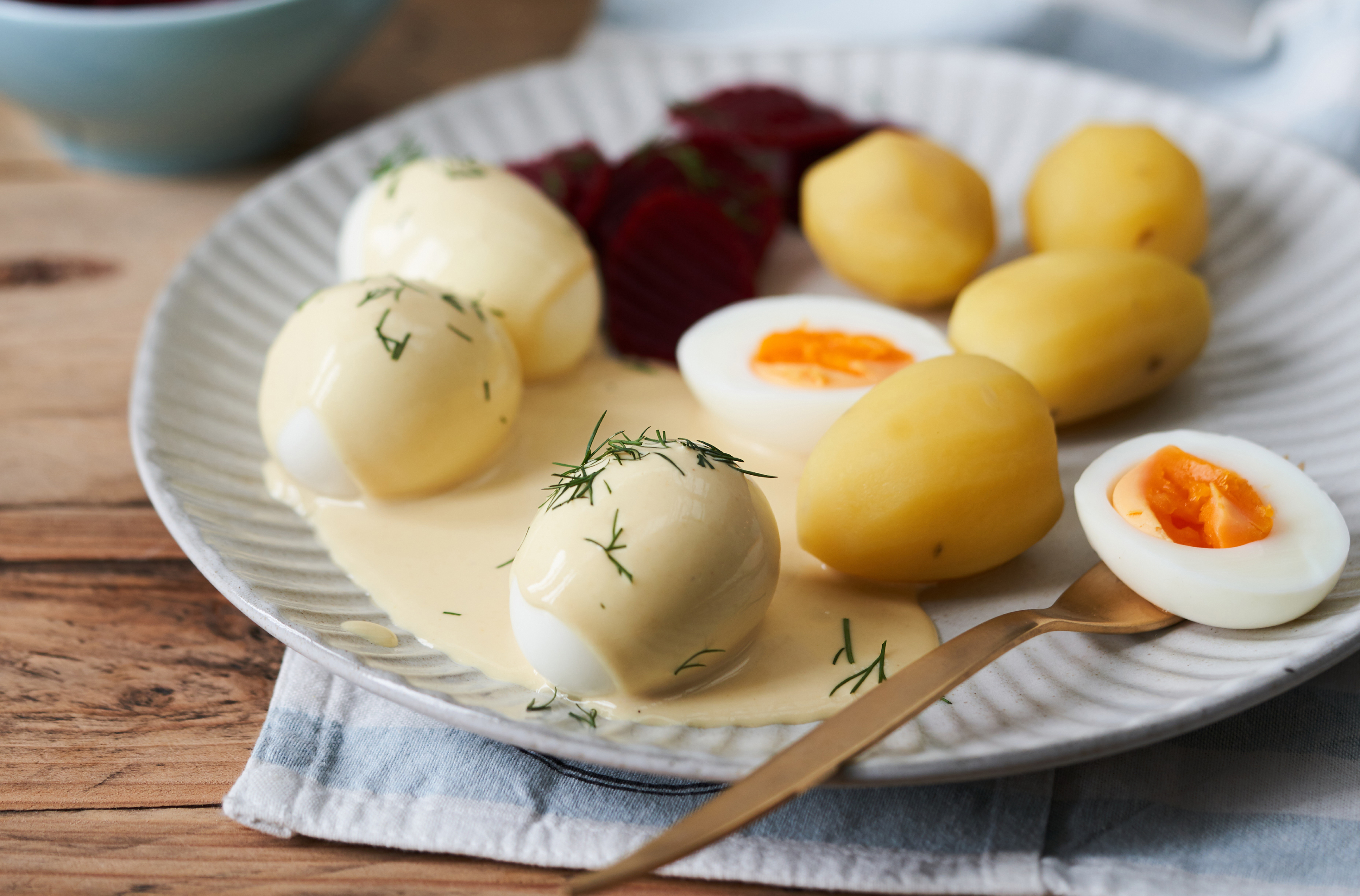 Echter Bautzner Senf ist nicht nur pur der geschmackliche Volltreffer sondern auch in Marinaden in Dressings oder als Soße. Auf die Einkaufsliste setzen Schmecklecker67 Rostbratwürstel und Senfsauce im Weggla So. Eier mit etwas Sauce auf einem Teller servieren.